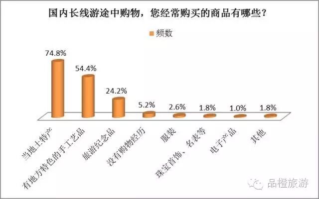 《報告》針對國內長線游購物的調查顯示,當地土特產是所有受訪者最經常購買的產品,頻數為74.8%,其次是有地方特色的手工藝品,頻數為54.4%。總體上,有購物經歷的受訪者占比超過了90%。