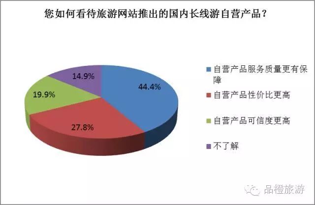 目前,國內OTA平臺都在力推自營產品,那么消費者是如何看待這些自營產品的呢?《報告》針對這一問題的調查顯示,44.4%的受訪者認為“自營產品服務質量更有保障”,27.8%的受訪者表示“自營產品性價比更高”,19.9%的受訪者認為“自營產品可信度更高”。總體來看,大多數受訪者認為旅游網站自營的國內長線游產品的質量更加可靠、可信。