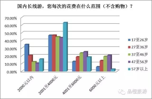 同程旅游調查數據顯示,46.5%的受訪者每次用于購買國內長線游線路等旅游產品的花費在2001至4000元之間,花費在4000元以上的合并占比32.6%,總體上消費水平處于中高層次的受訪者占多數。這一消費水平分布間接表明,當前在線旅游用戶日益重視國內長線游的品質。針對該話題的分年齡統計顯示,“70后”和“60后”受訪者的整體花費水平略高于其他年齡組。